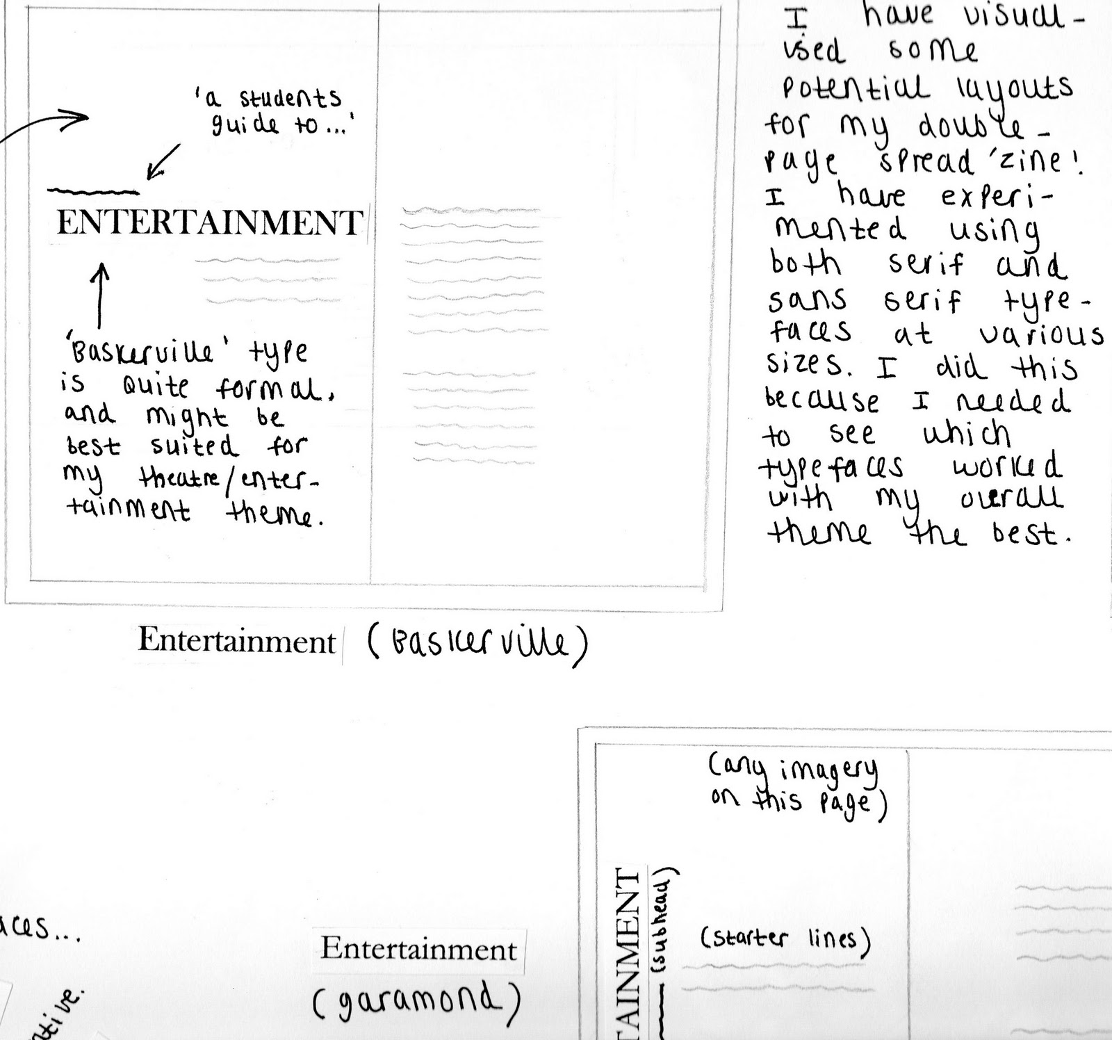 I tried to vary the stroke thickness and texture of the type, to best communicate my theme effectively. Through each layout I have tried to incorporate an interesting architectural theatre element, to show my concept ideas. I have produced many varying visuals, which are each differently displayed for experimentation purposes. During this exercise, I came up with some interesting ideas for the final DPS layout. I have tried to take certain elements (like type size/alignment) into account for later use.